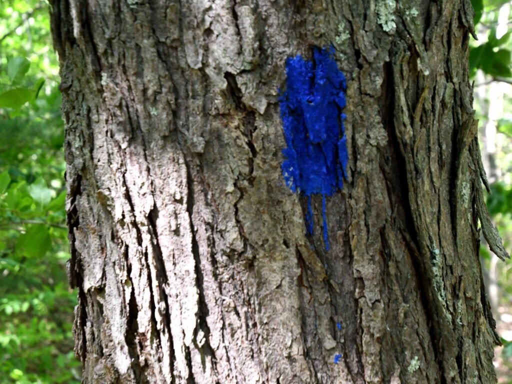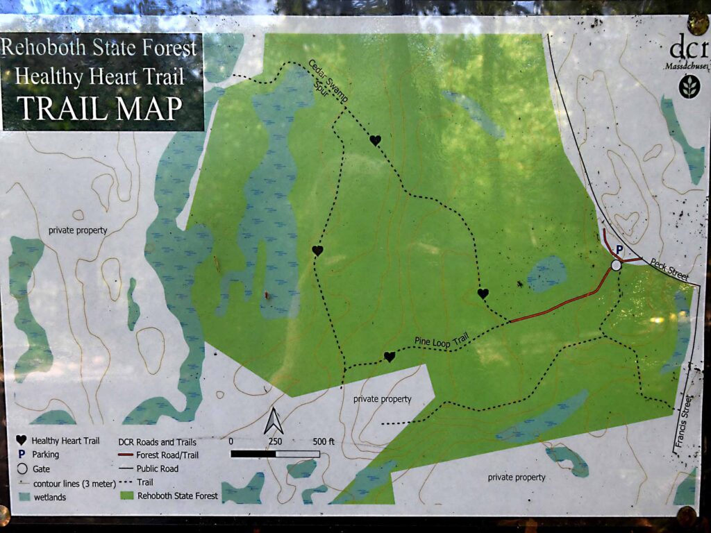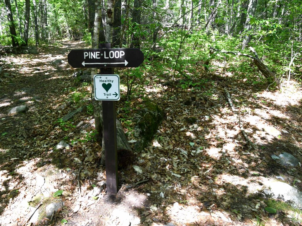 A trail map at the beginning of the trail points to a 1.25 mile Healthy Heart Pine Loop Trail that is clearly marked by DCR blue paint blazes on the trees.