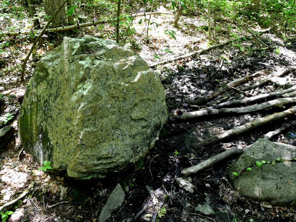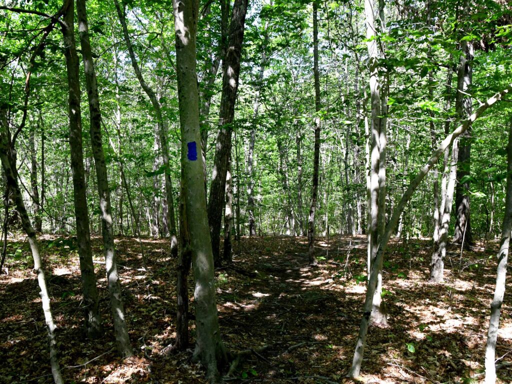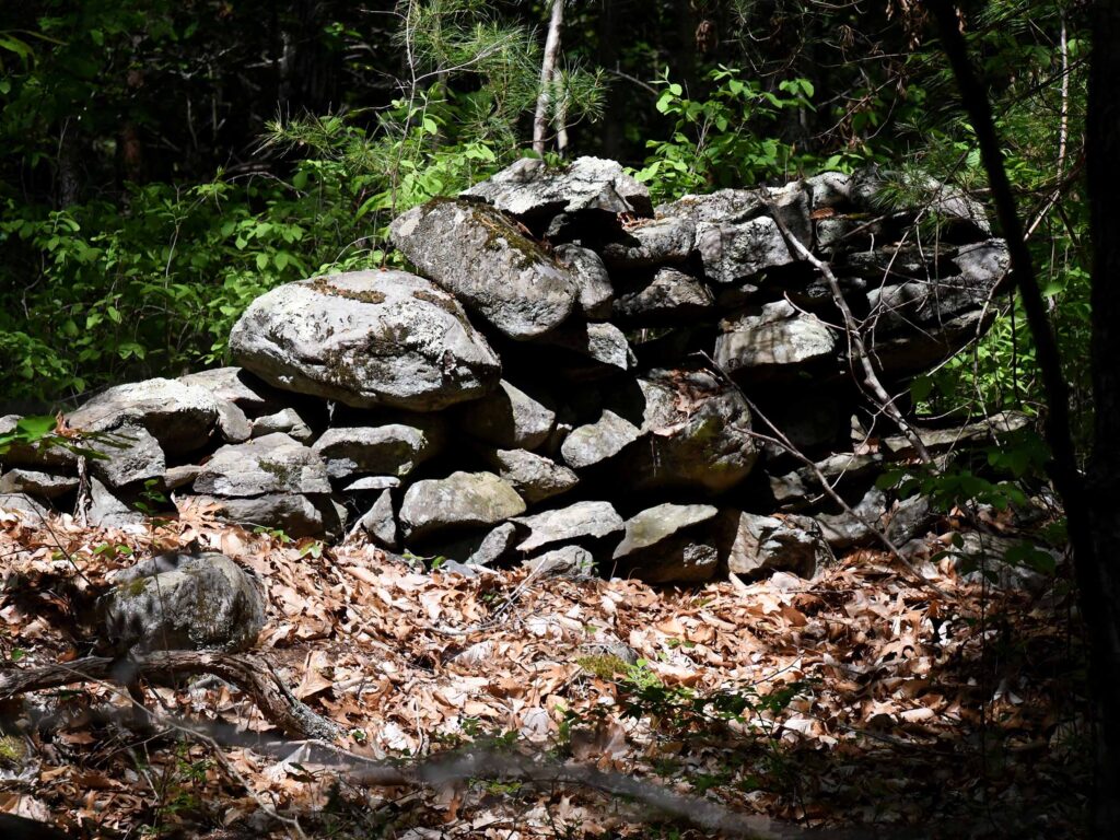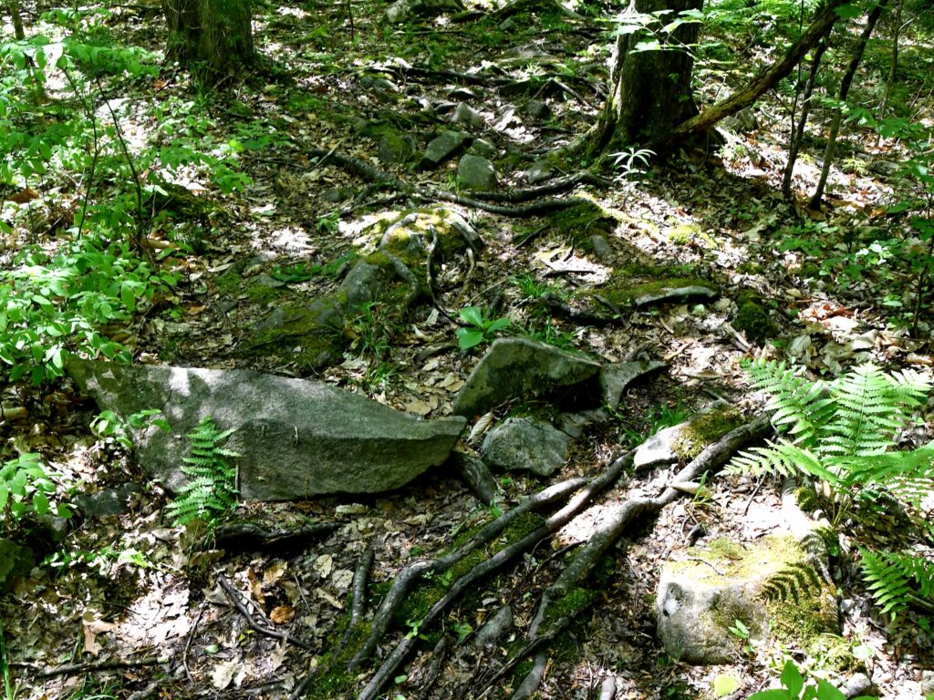 The remains of a stone wall are the only evidence of the parcel’s early use as a farm. The trails often contain rocks and roots that make walking challenging.