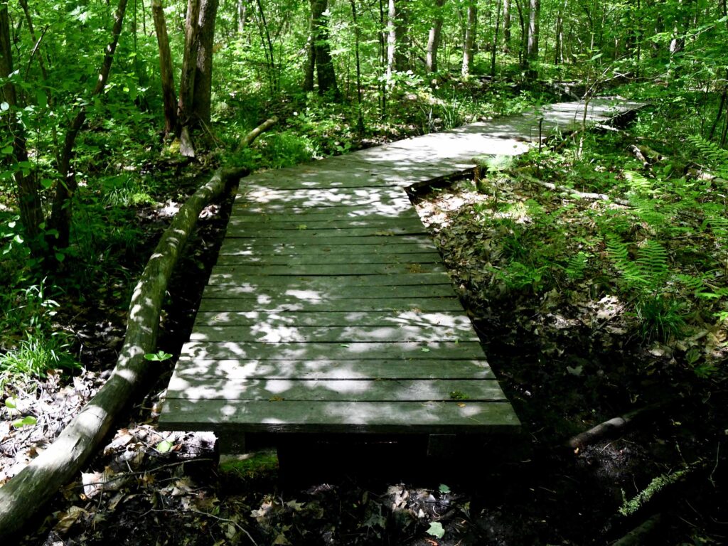 Some of the portions of the trail that abut the white cedar swamp have boardwalks over the most muddy sections.