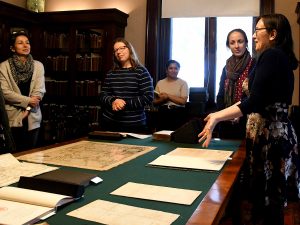 Assistant Librarian for Research & Reference Services Kimberly Nusco welcomes the group to a side room where the selections were on display for a limited time.