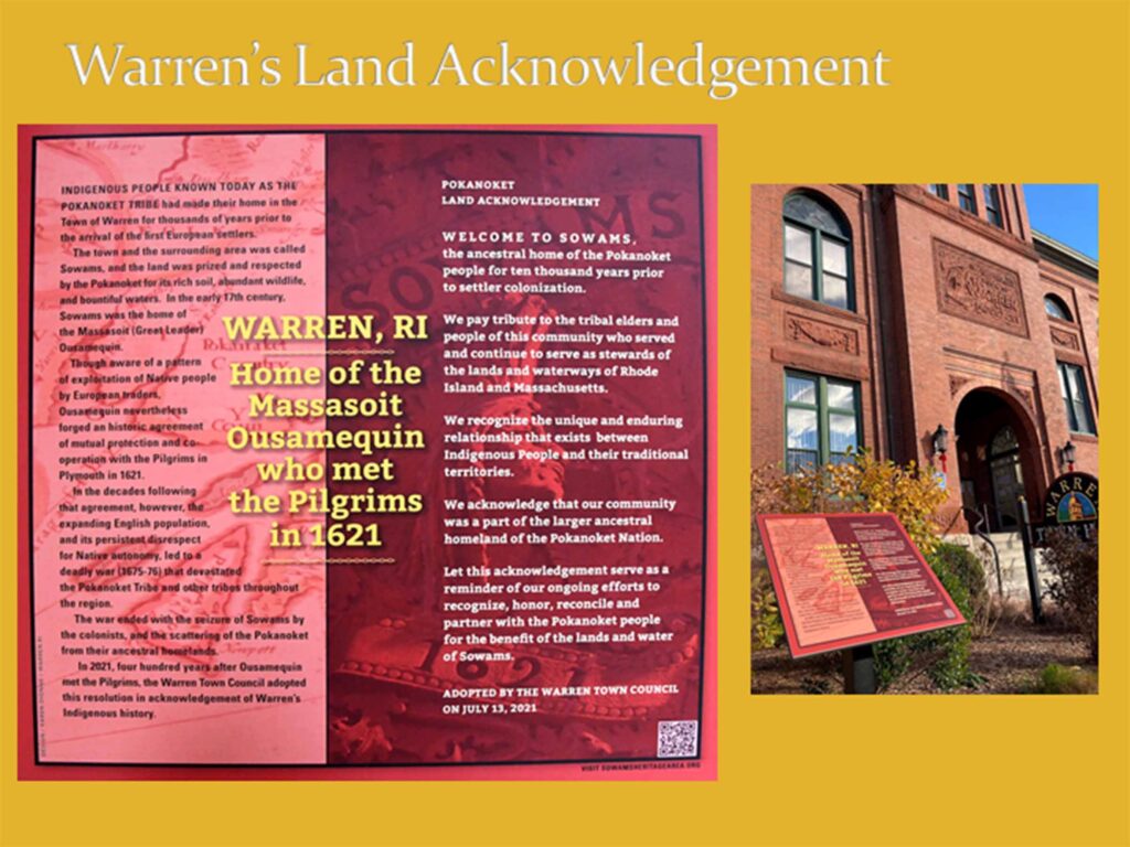(Above) Dr. Weed began by describing how Burr’s Hill looked before it was made into a park in 1924, with high sand dunes overlooking the Warren River. He also pointed out the location of a fence along Market Street that once separated colonial land from Pokanoket land. Today, a sign stating the Land Acknowledgement that the Town adopted in 2019 recognizing the Pokanokets sits in front of Town Hall.