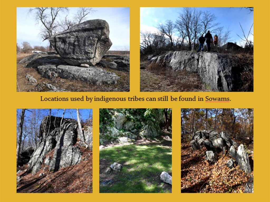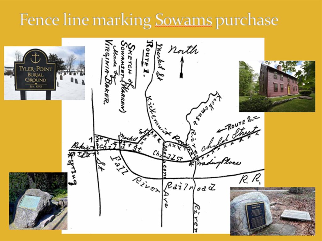 (Above, left) Dr. Weed pointed out rock features used by the Pokanokets at Sachem’s knoll and King’s Rock on Market Street at the Swansea town line and rocks behind Swansea Town Hall, at Mt. Hope in Bristol, and at the top of Neutaconkanut Hill in Providence. (Above, center) Over the 1600s, land was transferred from Indigenous control to colonial English domination (click on map for a larger view). (Above, right) Pilgrim Edward Winslow visited the Massasoit Ousamequin in what is today Warren when the Massasoit appeared to be dying from an unknown illness, and Winslow was able to help him recover.