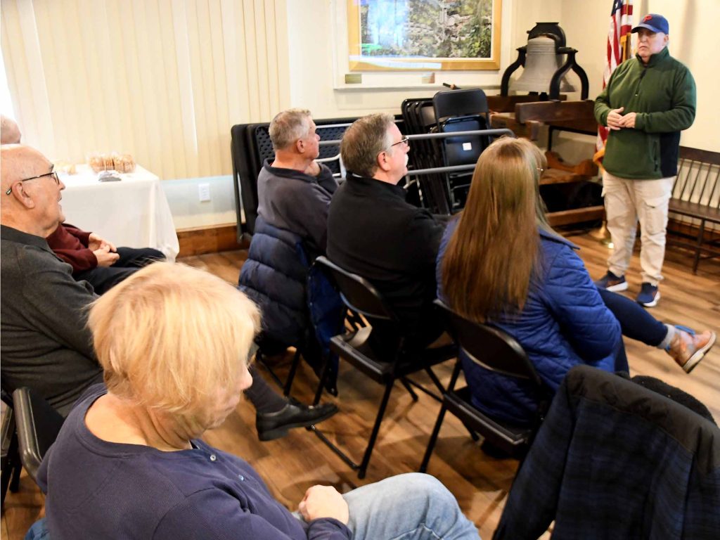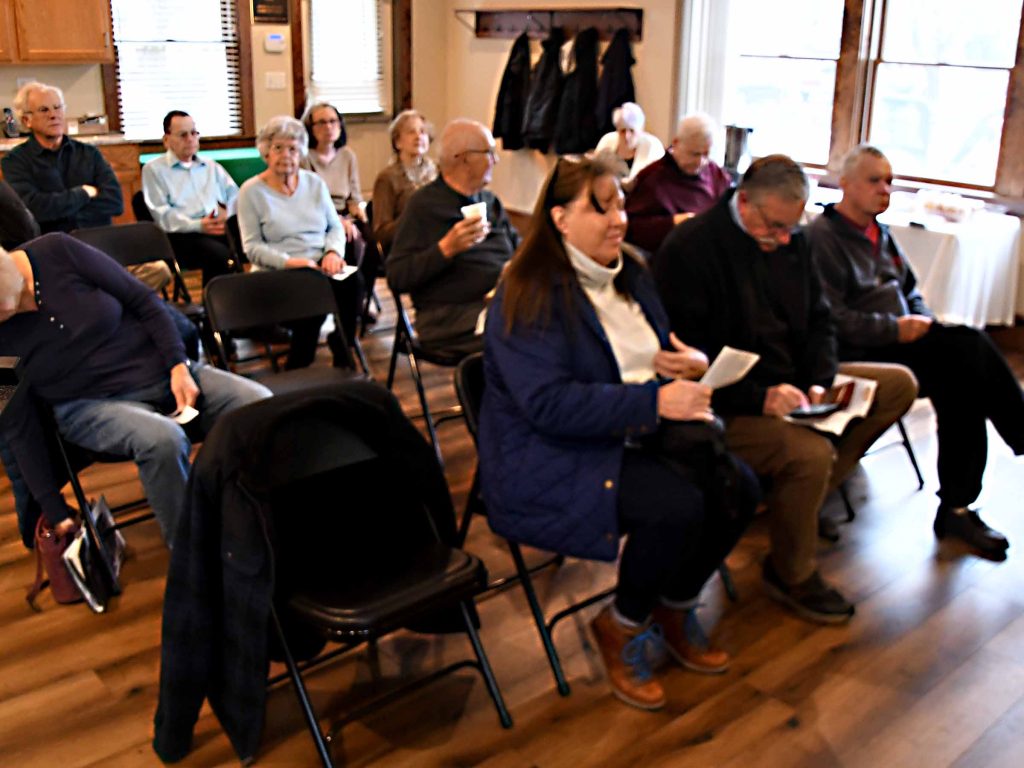 (Above) Charles Vacca, President of the Historical Society, welcomed an audience that filled the room for Dr. Weed’s presentation. Weed began by acknowledging that they were on Narragansett land.