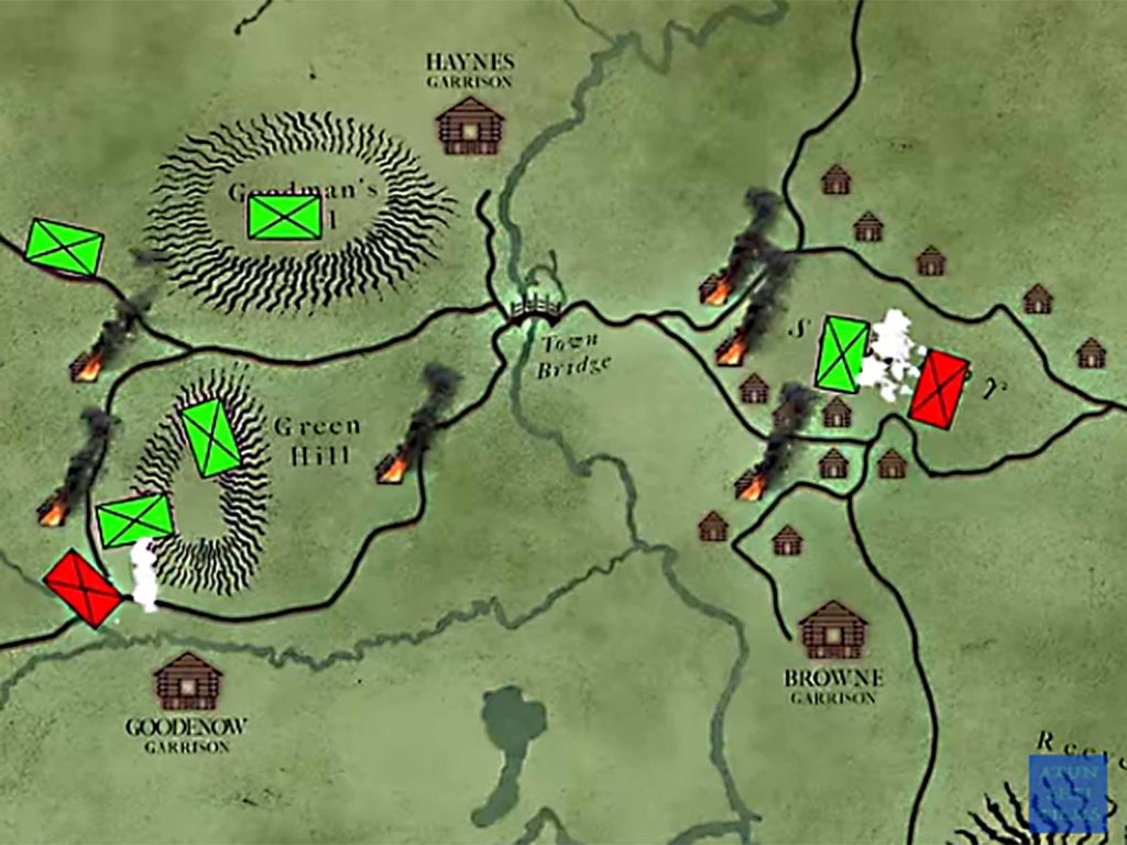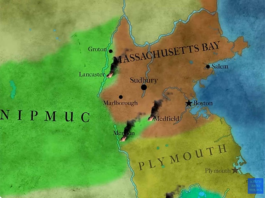 Later in the film, the April 21, 1676 attack during King Philip’s War is depicted in what is today Sudbury and Wayland, Massachusetts, when approximately five hundred Wampanoag, Nipmuc, and Narragansett Native Americans raided the frontier settlement of Sudbury in Massachusetts Bay Colony.