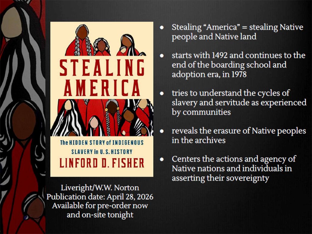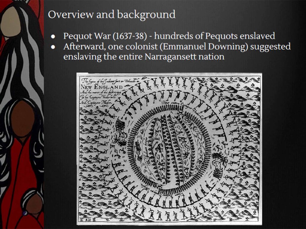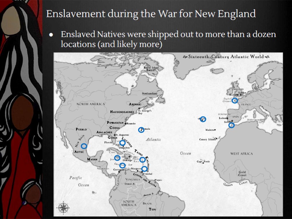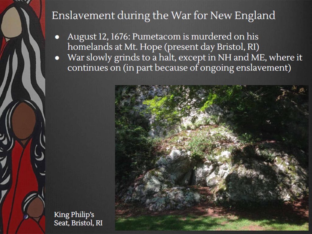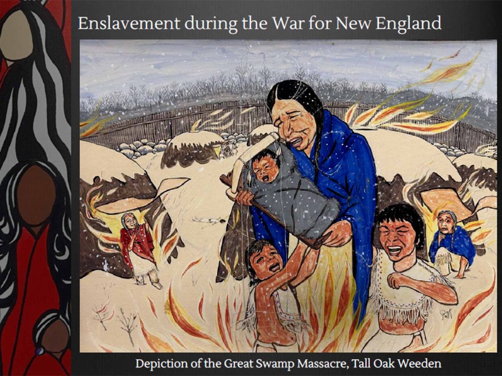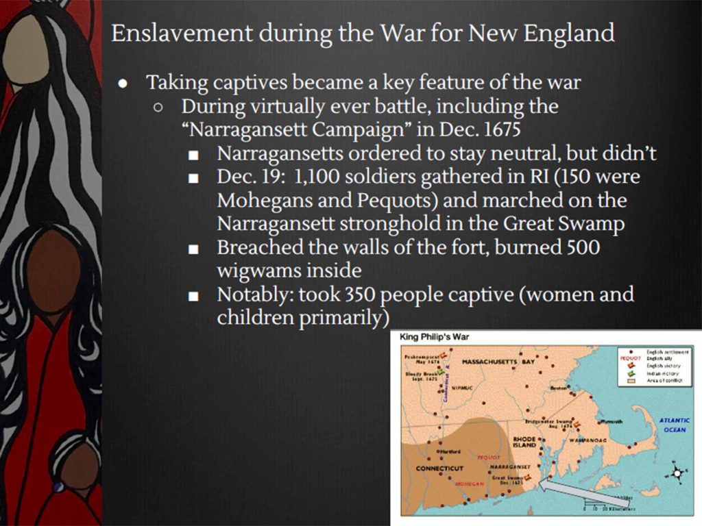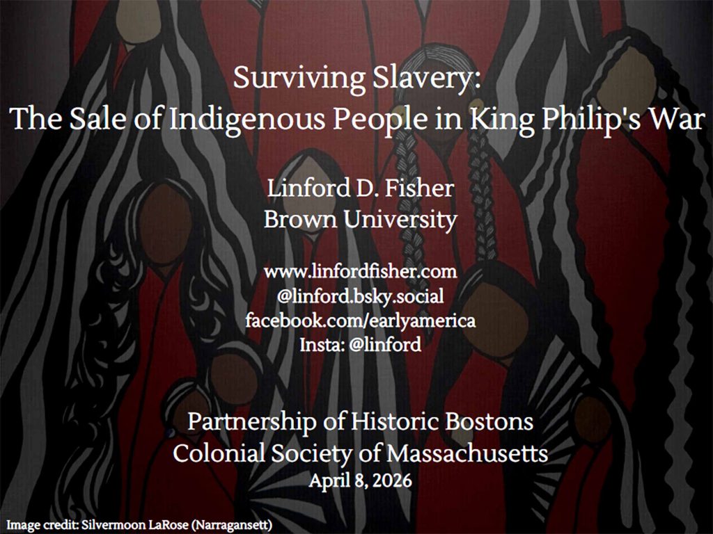 Men, women, children – anyone who was Indigenous could be captured, enslaved and sold by English colonists as a systematic weapon of King Philip’s War, says Brown University historian Linford Fisher. This important presentation, given at the Colonial Society of Massachusetts, April 8, 2026, describes the terror of “selling away,” the cost of families wrenched apart, and the fate of captives sold into slavery thousands of miles from home. Click here for a 71-minute presentation posted on YouTube by the Partnership for Historic Bostons.