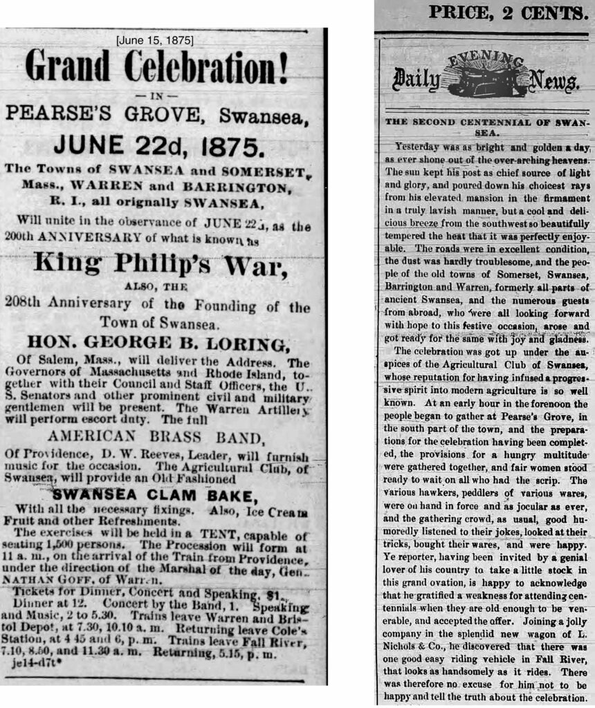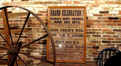 King Philip’s War broke out in Swansea on June 22, 1675 and changed the course of history for both the Pokanoket Tribe and the colonists who had occupied the area starting in 1653. Two hundred years later, the Town of Swansea held a Grand Celebration, described in these news articles uncovered by Swansea resident George Petrin in December 2022. Above, a poster from the event is on display at the Luther Store Museum.