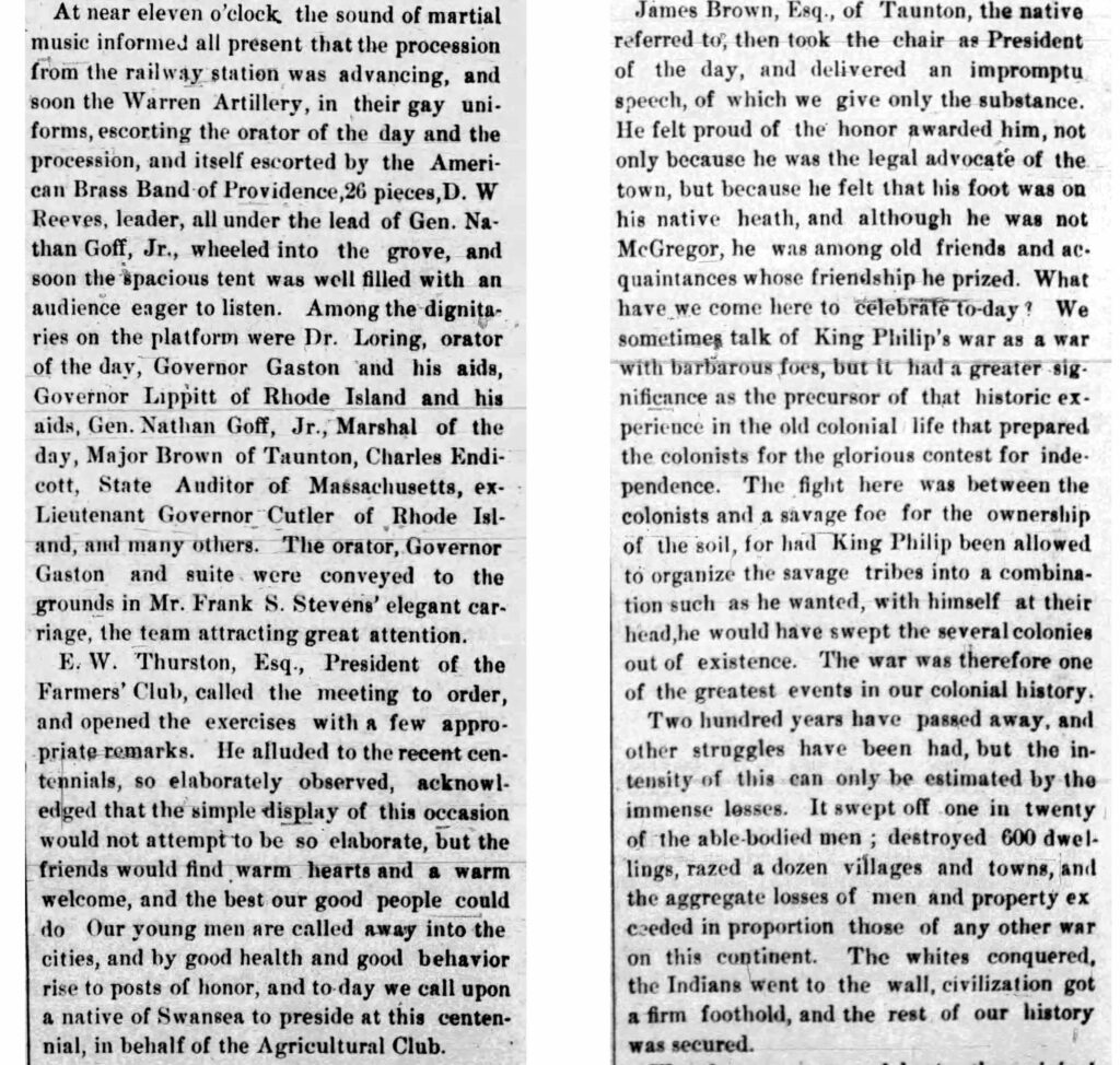 Even 200 years later there was no disguising that the motive for the War on the part of the colonists “with barbarous foes” was “for the ownership of the soil” and was seen as “one of the greatest events in our colonial history.” No mention is made of the devastation on the Pokanokets and other tribes who saw the near genocide of their people and culture, a fact only recently begun to be acknowledged.