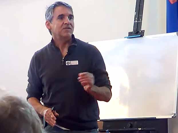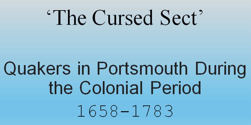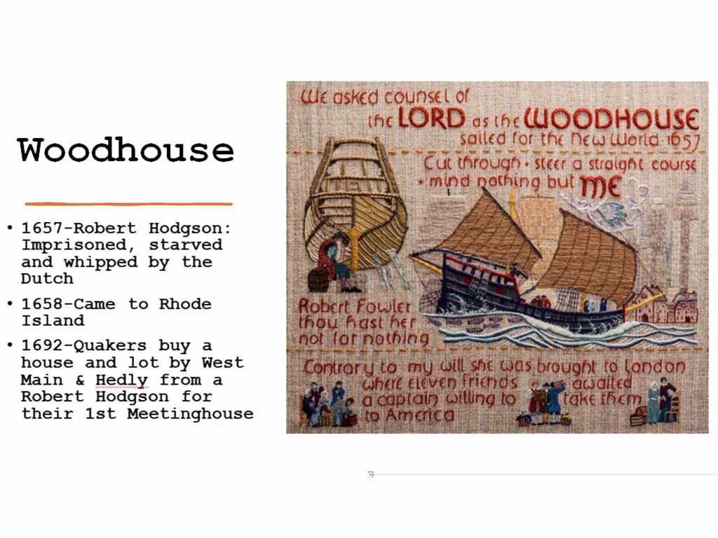 (Above) Luce began his presentation with a description of Quaker founder George Fox, who, in 1647 began an organization that he called the “Children of the Light“, which became known as the Society of Friends. In 1657, Robert Hodgson organized a group of eleven Quakers from England to crew their own ship, Woodhouse, to Newport where they eventually bought a house in Portsmouth in 1692 to use as a meeting house.