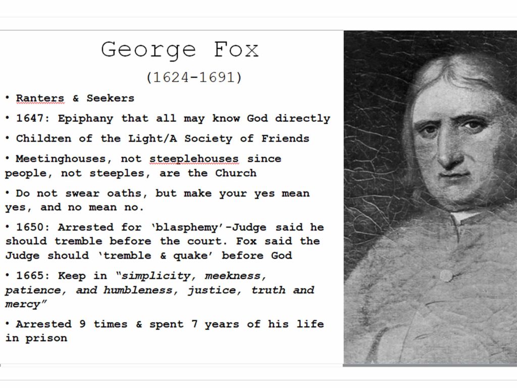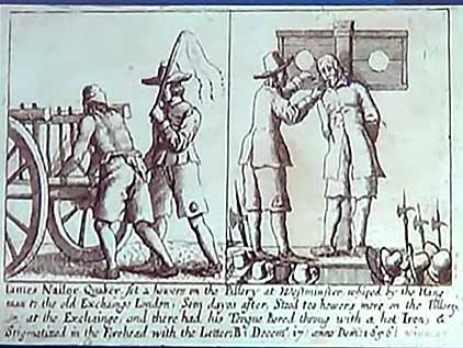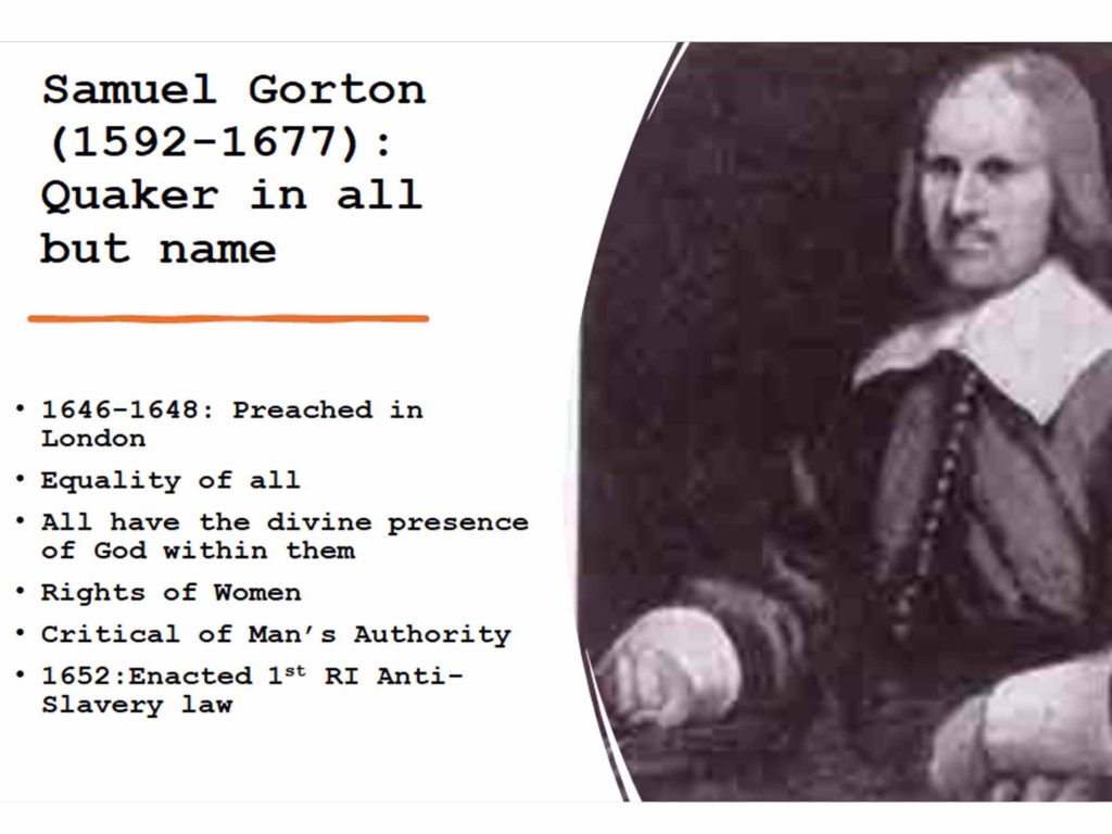 (Above) Samuel Gorton, who was a Quaker in all but name, founded Warwick, RI after being kicked out of every other town. At the time, Portsmouth had only 300 to 1500 people, but roughly half of them became Quakers. From their time of arrival in Massachusetts, they were severely punished, including by public whipping and having their tongues bored through with a hot iron.