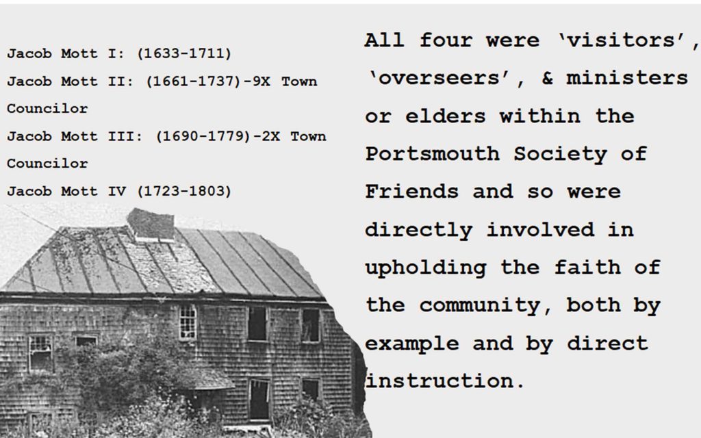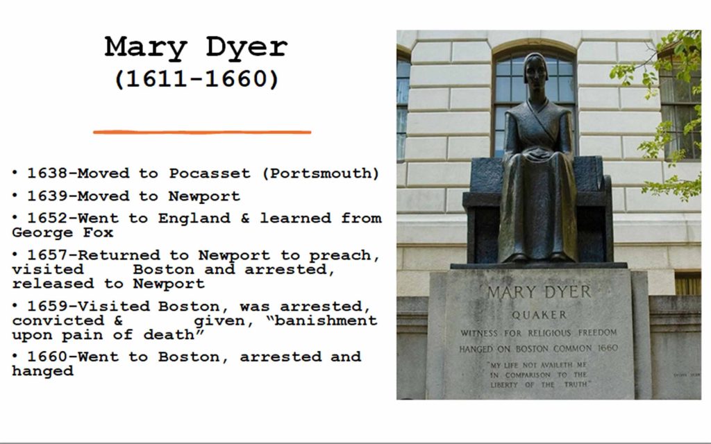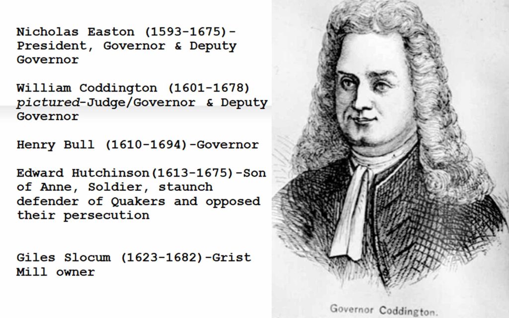 (Above) Perhaps the best known Quaker of the time was Mary Dyer, who chose in 1660 to be hanged in Boston rather than denouce her faith. The Mott Farm in Portsmouth was owned by a family Quakers for 255 years before it was finally demolished in the 1970s. Among the many Quakers in Portsmouth was William Coddington (1601-1678) who served as a Judge, a Governor of Rhode Island and a Deputy Governor.