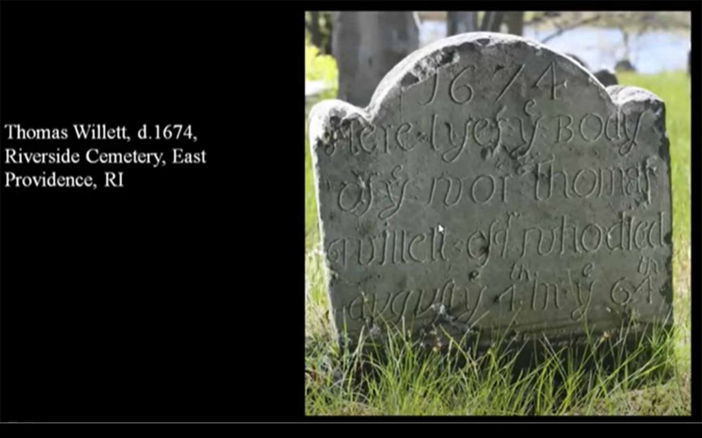 Thomas Willlet, a leading figure of Plymouth Colony, has the above, right gravestone, from 1674 and can be found in the Ancient Little Neck Cemetery, in East Providence, RI.