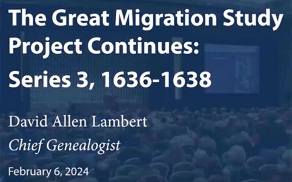 Since 1988, the goal of The Great Migration Study Project has been to compile comprehensive genealogical and biographical accounts of the twenty thousand English men, women, and children who settled in New England between 1620 and 1640. Click here for an 88-minute video of this February 3, 2024 recording of Chief Genealogist David Allen Lambert.