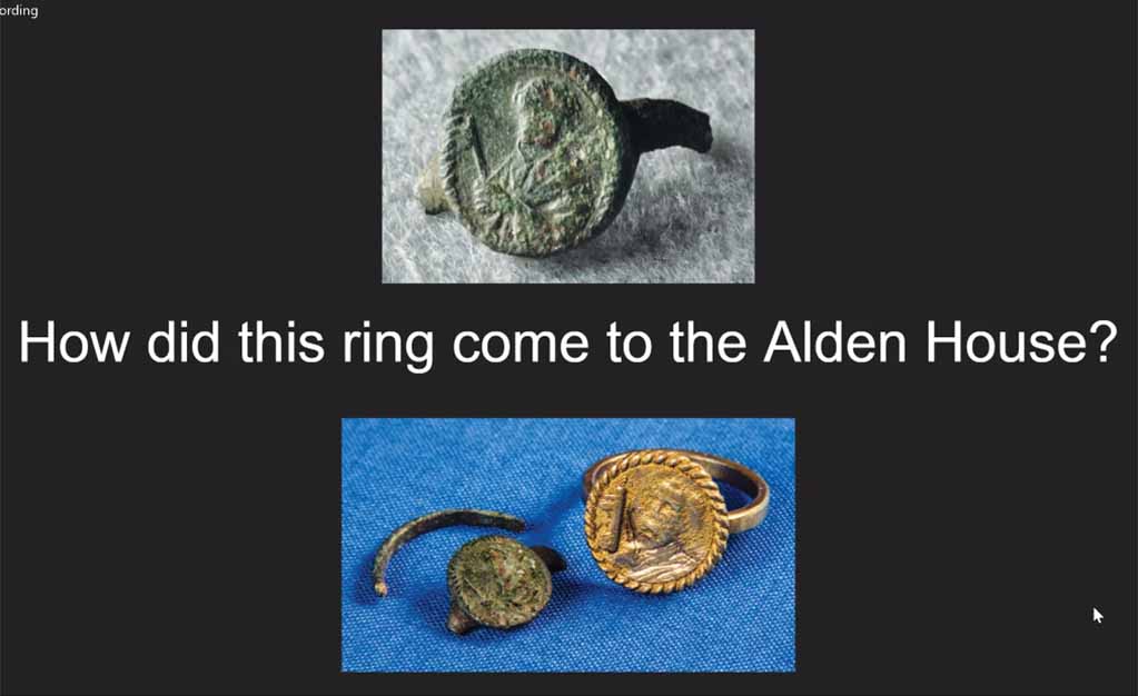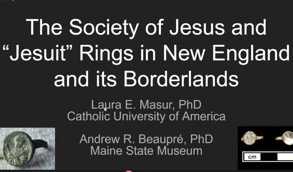 This talk explores Jesuit interactions with Indigenous communities in light of Colonial politics, as well as archaeological sites and artifacts associated with Jesuits in the northeast, like the trade ring uncovered at John and Priscilla’s 17th-century homesite in Duxbury. Click here for a 73-minute YouTube video of the talk.