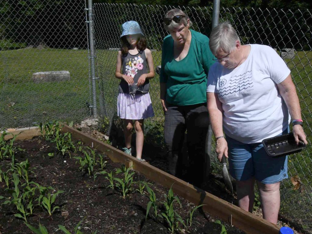 Girl Scout Katie Gregory and East Providence Historical Society board members Nancy Moore and Dotty Thornley look over the corn that has begun to grow in their Three Sisters garden in early June at Hunts Mills Community Garden. Pokanoket Tribe member Elsie “Napauz” Upshaw has been guiding the group in their planting. Click here for a six-minute video.