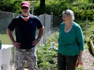 Tom talks with EPHS Treasurer Dotty Thornley about a science project that Katie is doing about the effect of talking to plants in positive and negative ways. The rest of the Community Garden is going great.