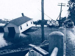 A boat house built by Matthewson in the 1880s is pictured following the 1938 hurricane.Three ferry crossings of the Barrington and Palmer Rivers behind it are known to have been in operation nearby beginning in the late seventeenth century. The earliest, established in the 1681-82, crossed the Palmer River in the location of the present bridge, and was later known as Kelley’s Ferry after the family that held the franchise for several generations. A second ferry, established before 1739, crossed the Barrington River between Phebe’s Neck and New Meadow Neck. Humphrey’s Ferry, later known as Martin’s Ferry, connected Ferry Lane in Barrington to the foot of Washington Street in Warren.The area was developed as a residential area following the construction of a railroad connection to Providence in 1855. [from Historic and Architectual Resources of Barrington, RI, 1993]