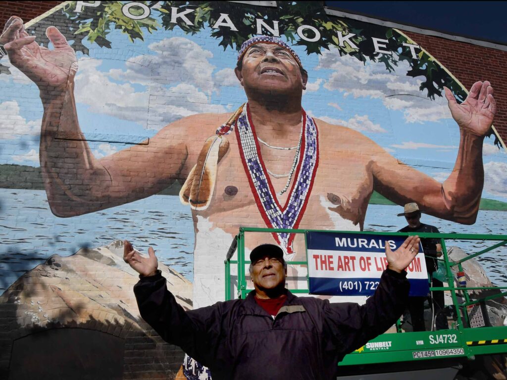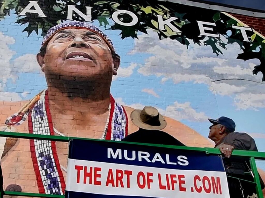 As the new mural in Watchemoket Square nears completion, Pokanoket Sagamore Winds of Thunder and Sachem Dancing Star had a chance to meet with artists Bonnie Lee Turner and Charles C. Clear III of The Art of Life at the location on October 11, 2023. Click here for a five-minute video of the occasion.