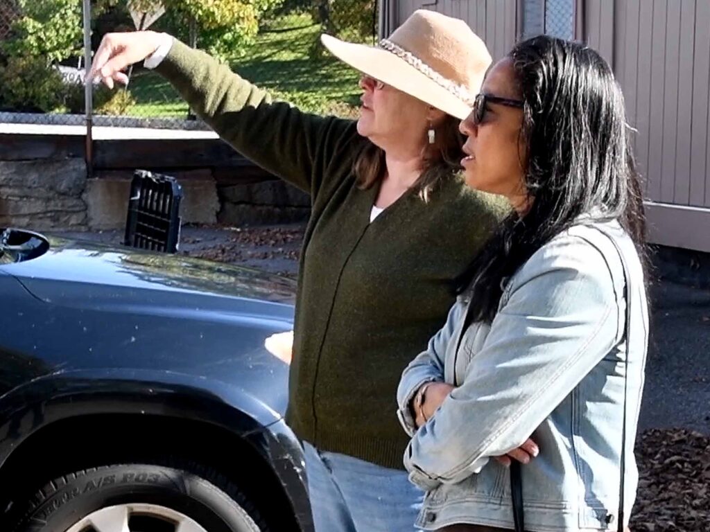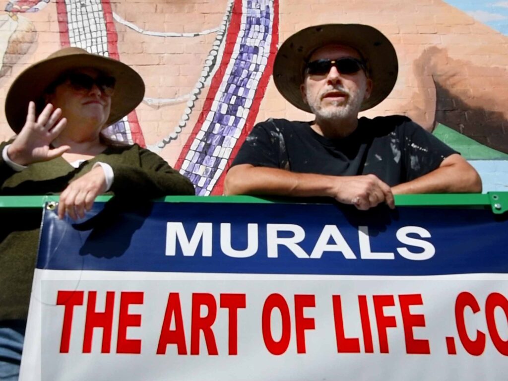 (Above) The Sagamore and Sachem get their first look at the mural with artist Bonnie Lee Turner and reacted with smiles and surprise as she pointed out some of the details.