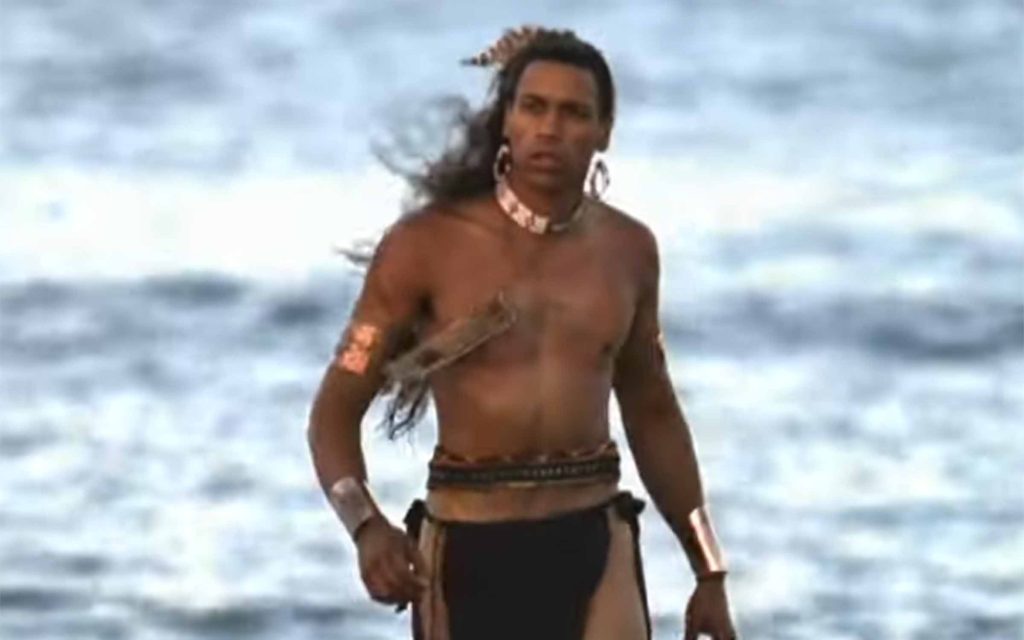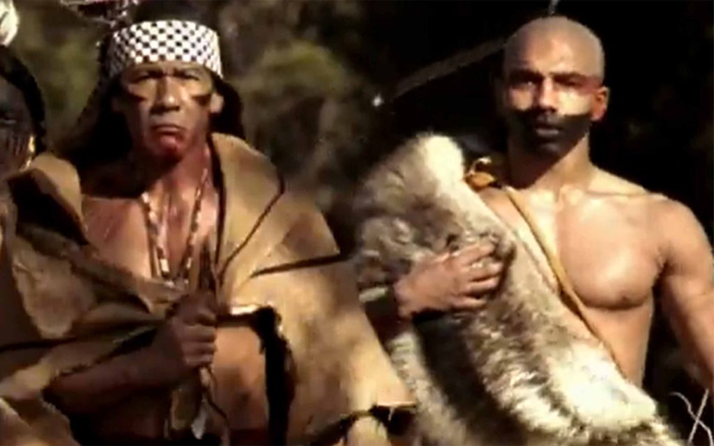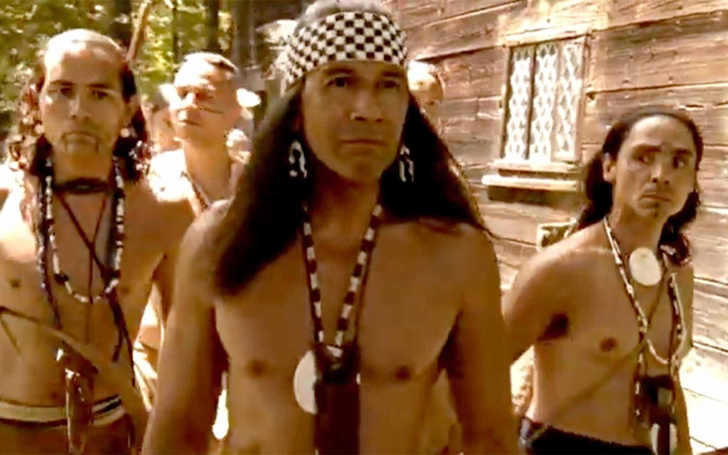 The film, narrated in part by Nipmuc Anthropologist Rae Gould, actor Marcos Akiaten (Chiricauha Apache) depicts the Massasoit Ousamequin (above center) when he agreed to give the English the help they needed through a mutual protection treaty. He calculated that a tactical alliance with the foreigners would provide a way to protect his people and hold his Native enemies at bay.