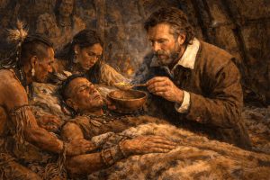 Pictured, Winslow & Hopkins meets with Ousamequin at Sowams in 1621. Winslow cures Ousamequin in 1623.