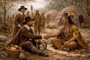 A trip to Sowams was made by the Pilgrims, so that they could learn more about their neighbors and to make some additions to their treaty. This time, Edward Winslow and Stephen Hopkins were chosen to make the trip. Massasoit came out to see them when they arrived at the end of their several-days journey. They reaffirmed their peace with one another, and the Massasoit agreed to tell his people to stop making random visits to Plymouth looking for food and entertainment; and he also agreed to send a messenger to contact the tribe from whom the Pilgrims took corn from upon their first arrival–since they had thus far not been able to repay them. [from [MayflowerHistory.com]